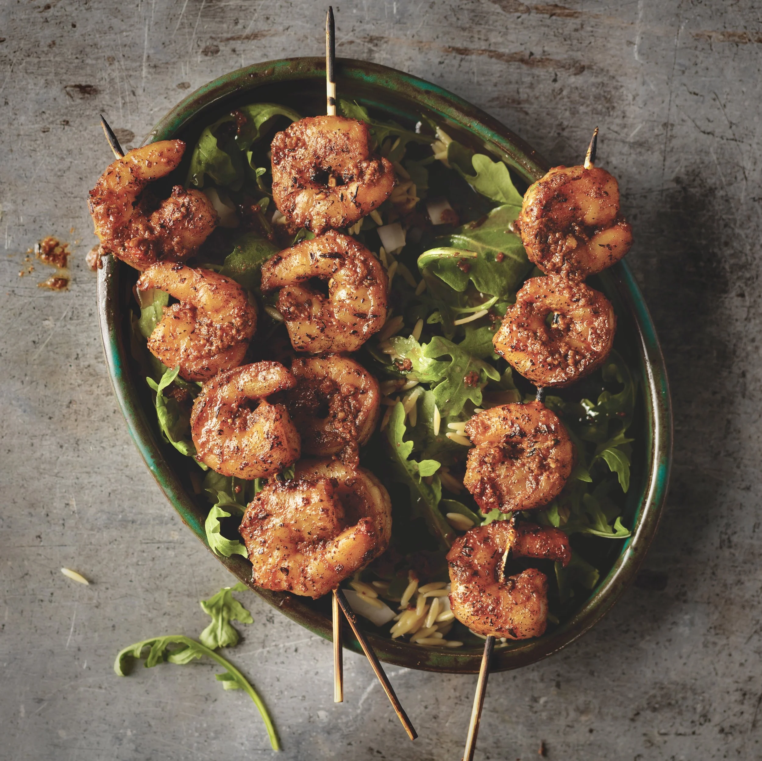 Marinated Shrimp Skewers on Arugula